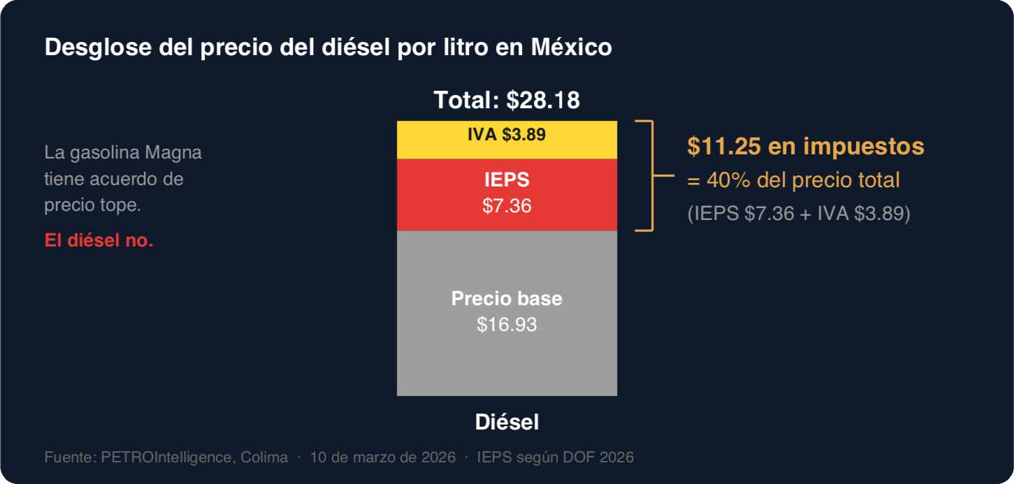 En México, el impacto ha sido directo. El diésel — el combustible que mueve al autotransporte de carga — alcanzó niveles récord cercanos a los $28 pesos por litro en Colima, y en algunos estados ya ronda en los $30.